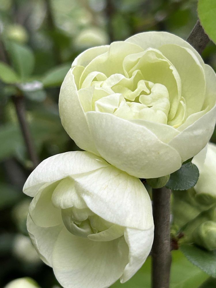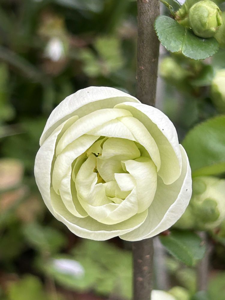 おはようございます😊白い木瓜は他の色にない上品で控えめな美しさを感じます🥰💕丸い蕾がだんだん大きくなる過程も楽しいですよね🤗