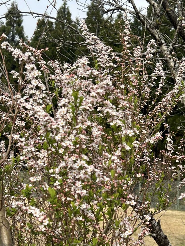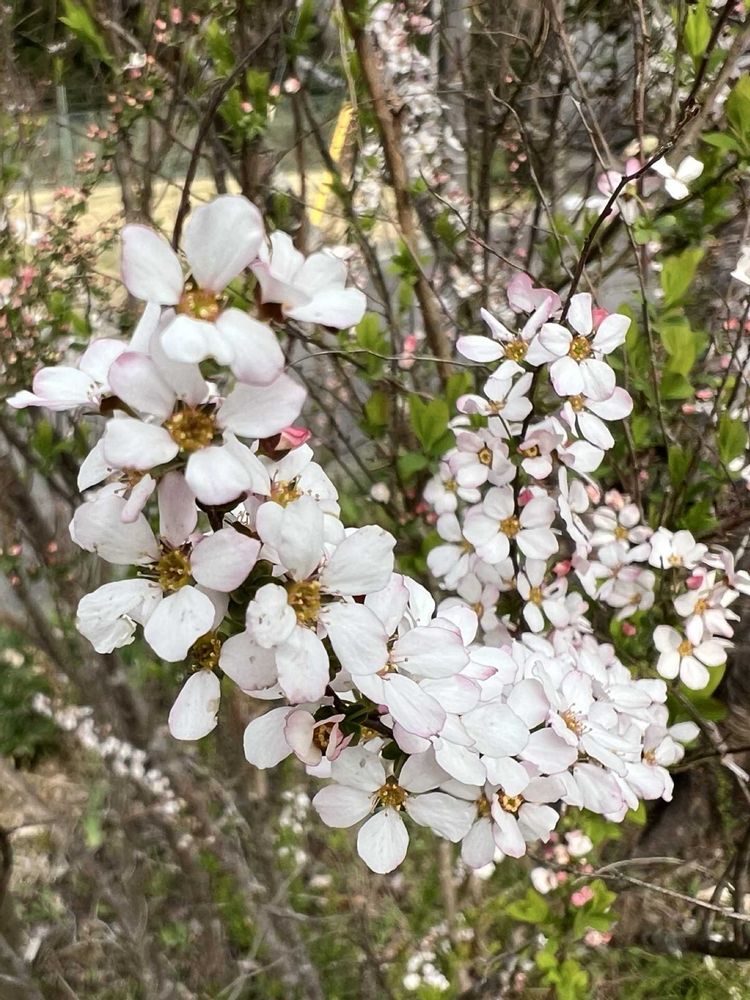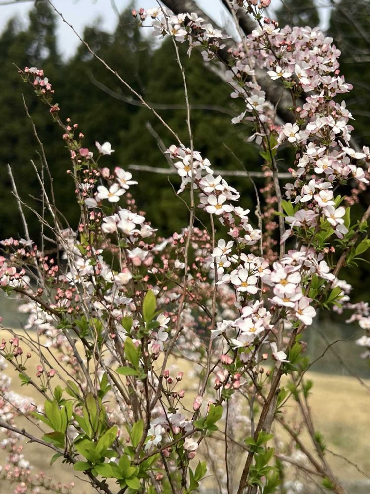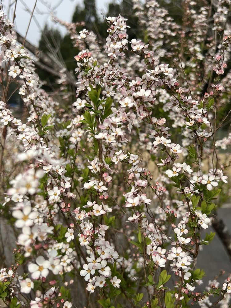 赤花雪柳が咲き始め、赤い蕾はやがて白い花に