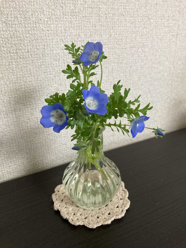 ちょうど小瓶が空いたので、ネモフィラが合うかなぁっと飾ってみました🩵ありがとうございます🥰