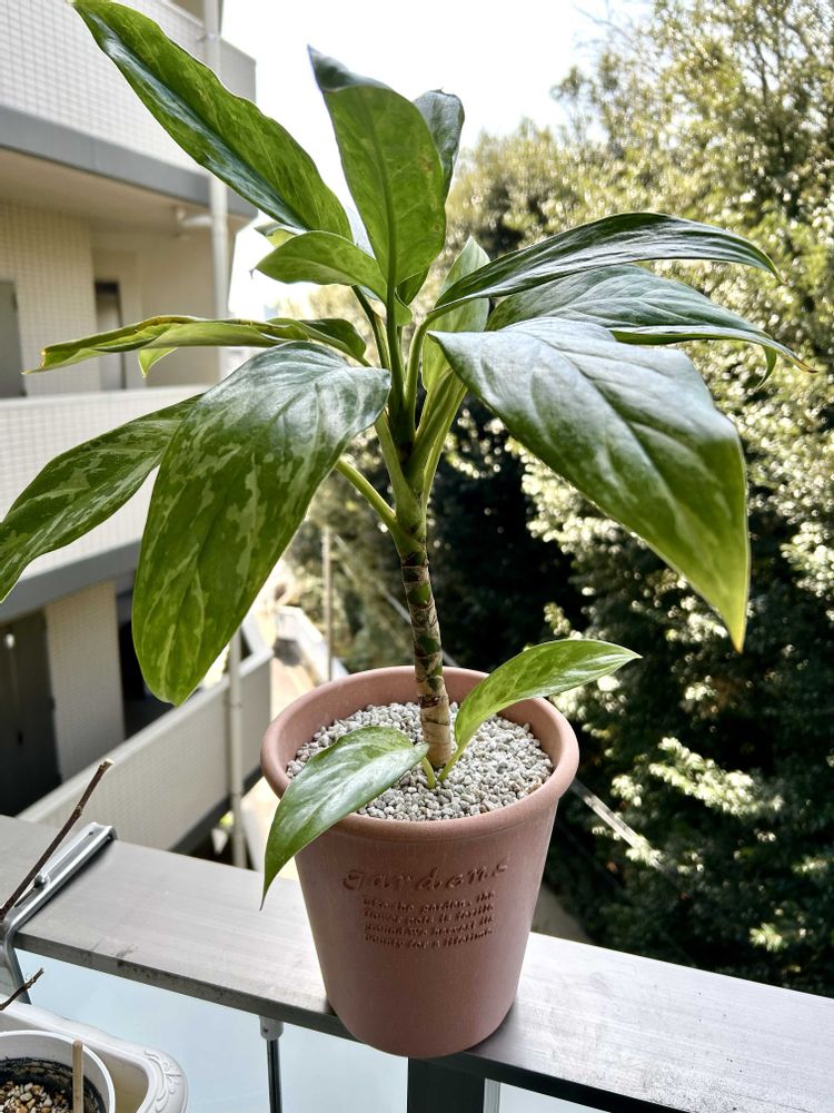 植替え😊アグラオネマブリリアントトリカラー🩵開けてびっくり🫢すごい根鉢でした👍素焼き風の鉢に鉢上げした😊今日もいい天気です