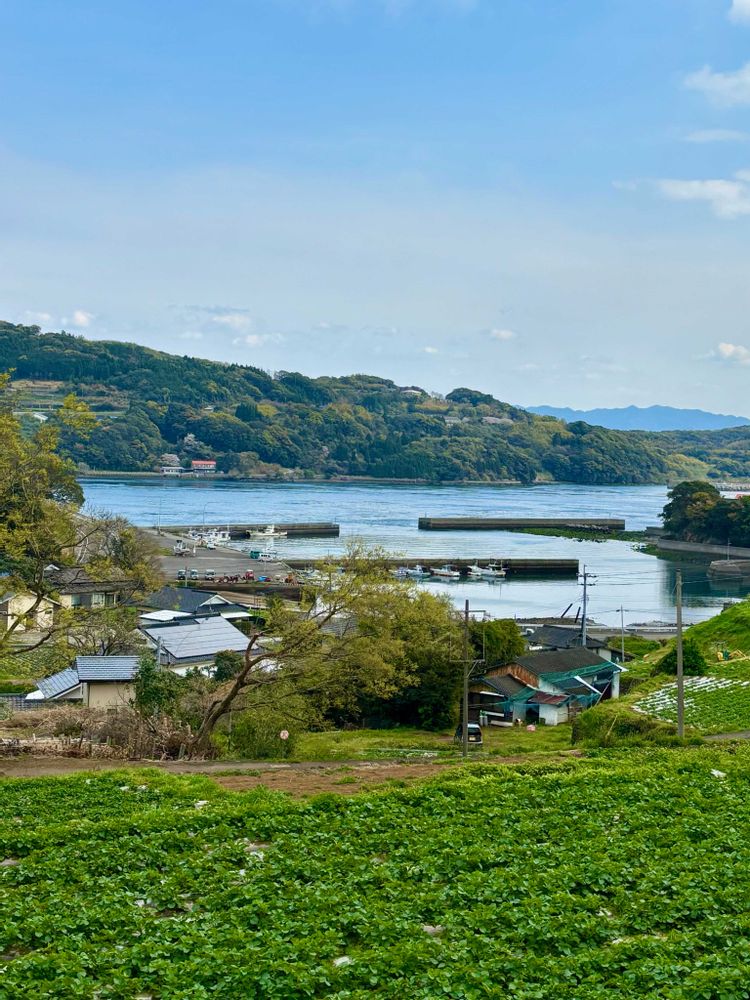 ジャガイモ畑の向こうに漁港が見えて良い景色ですね〜💚💙😊小さく船が見てえ🚢🚢🚢