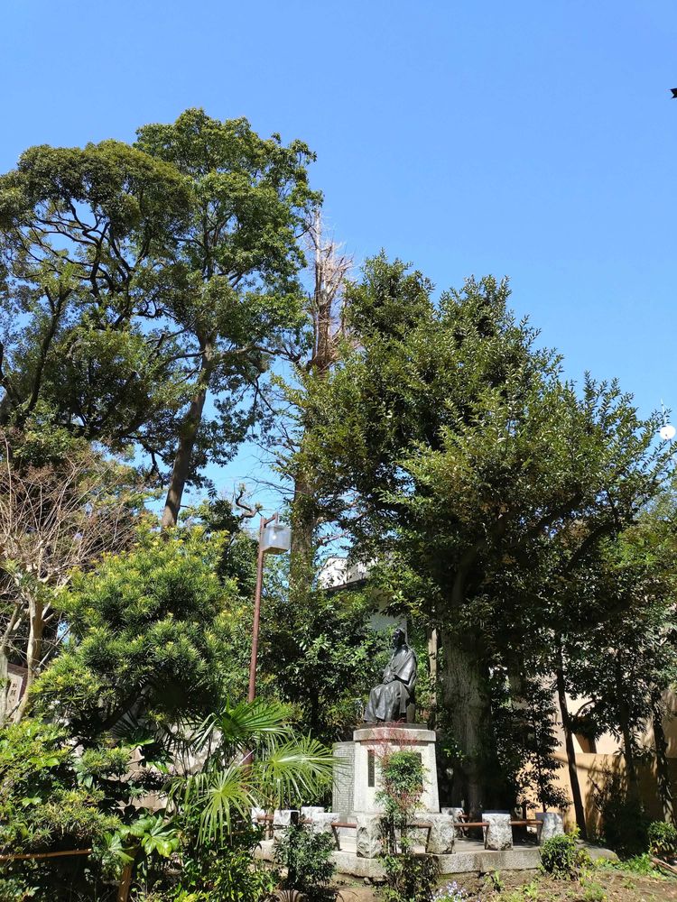 ❺栗山久次郎翁の銅像木々と青空に包まれ