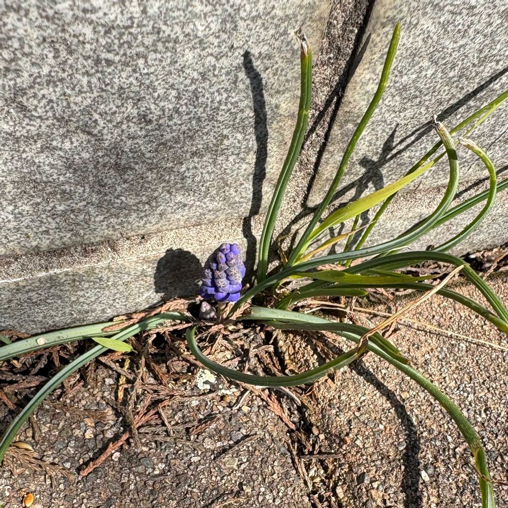陽当たりが良い所だと色付き始めてると思うよ〜。陽当たりが悪い日陰のムスカリは、細長い葉っぱの奥〜〜〜の方に小さな白っぽい蕾が縮こまっているよね?