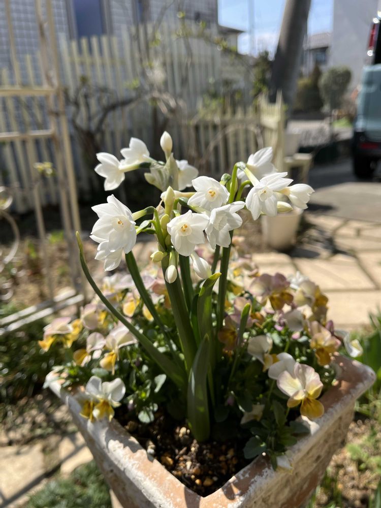 ①②ビオラと一緒に植えたスイセンもようやく開花
