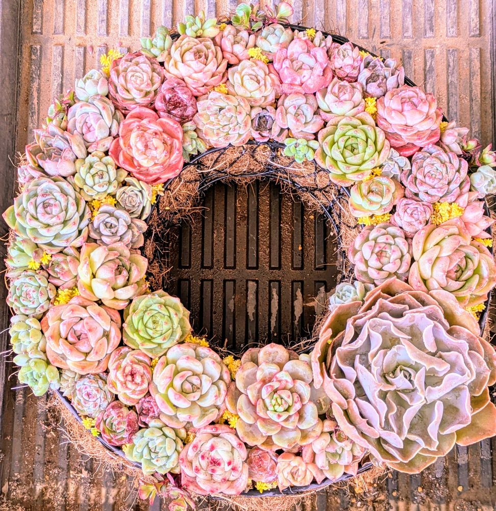 あちこちのスカスカになった寄せ植えを解体しまくって、エケベリアリースを作りました(笑)😄