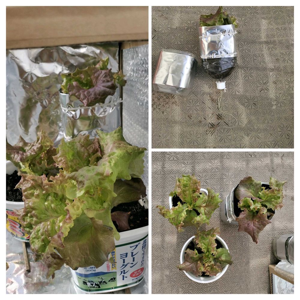 右上:ペットボトルの鉢。水受けに水が溜まっていたので根が伸びてしまった。