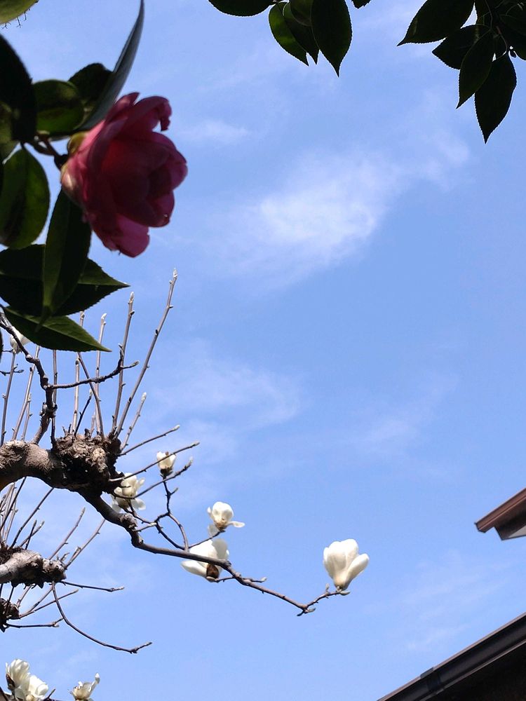 5枚目は違うツバキ越しの白木蓮