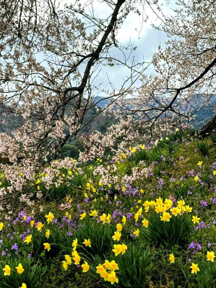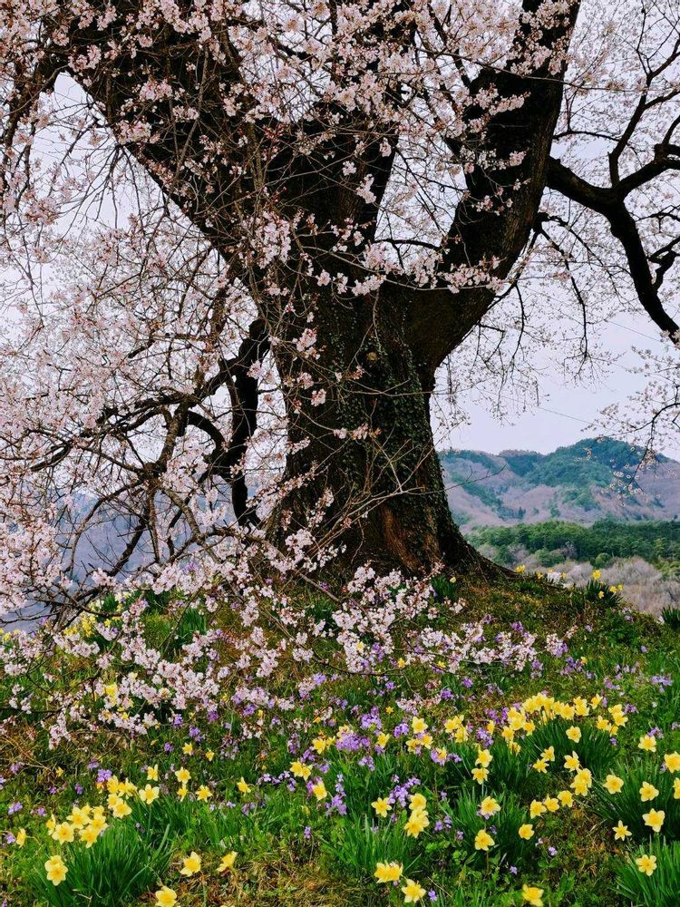 樹齢328年の孤高の一本桜。根元にスイセンが咲いていて、フォトジェニック。