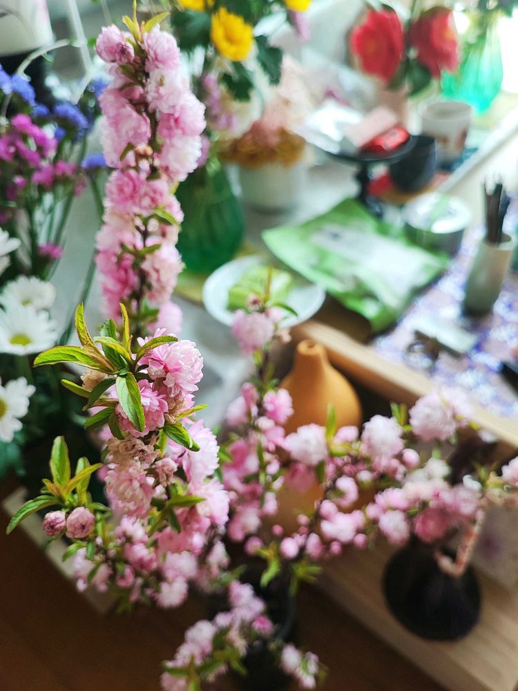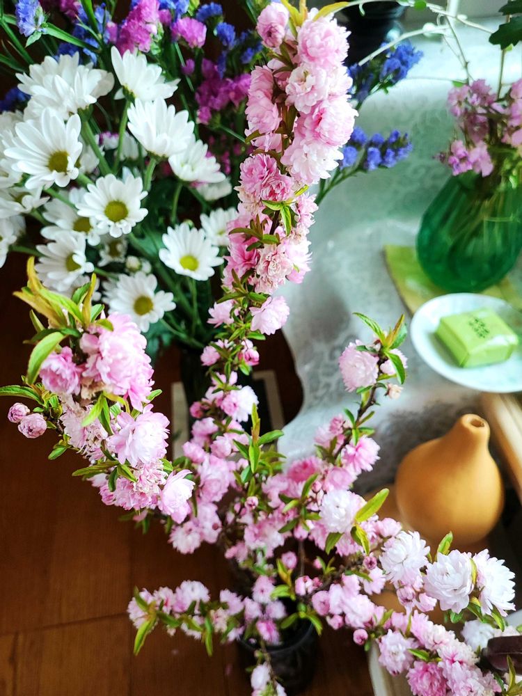 今年はニワザクラが大変よく咲いてくれたので、敷地の境界面からお隣の空き地に向かって伸びた大枝を2本、株元からカットして仏壇にあげました。みっちり密が可愛いです。