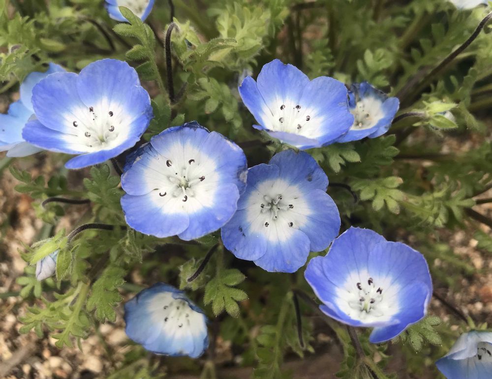 ネモフィラがよく咲いています。咲き始めよりもお花が少し大きくなったような。花弁にある点々が特徴的