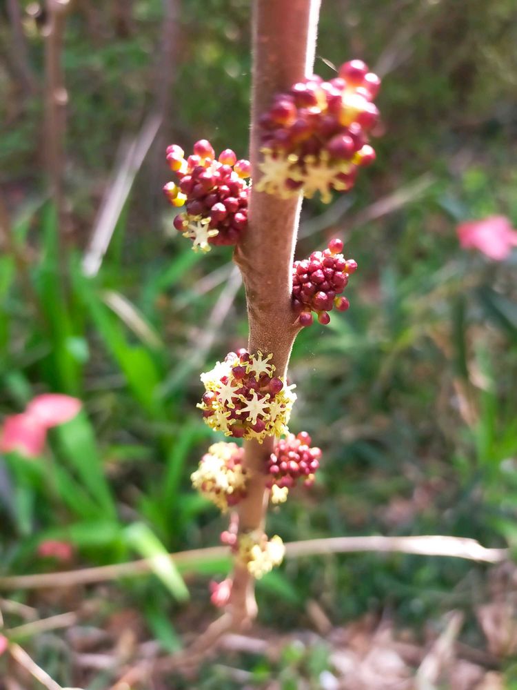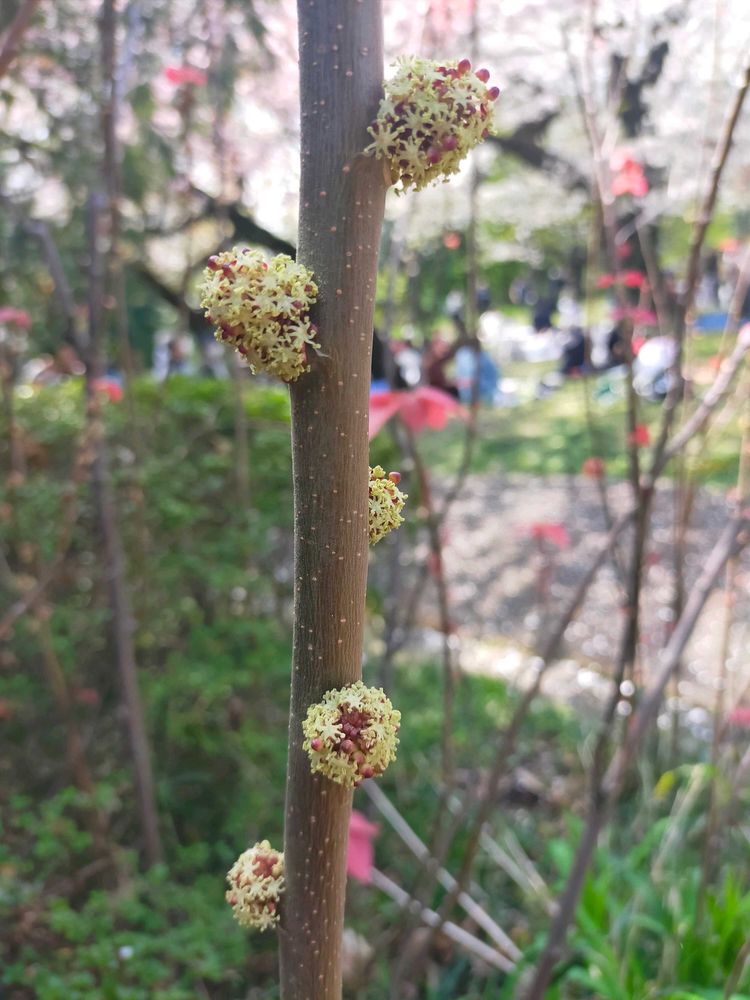 真っ赤な葉っぱにつられて近づくと、枝から直接生えてる奇っ怪なお花😳