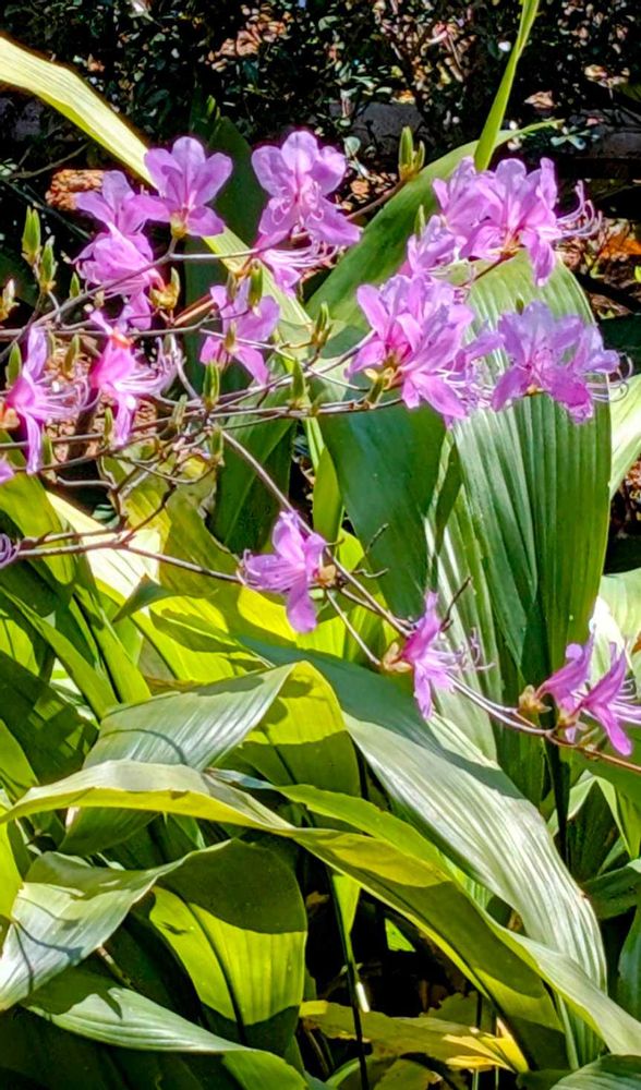 4月頃、葉の開く前に枝先に紅紫色の花を2~3個ずつつける。花の色は、薄紫や赤、白、絞り(咲き分け)など。