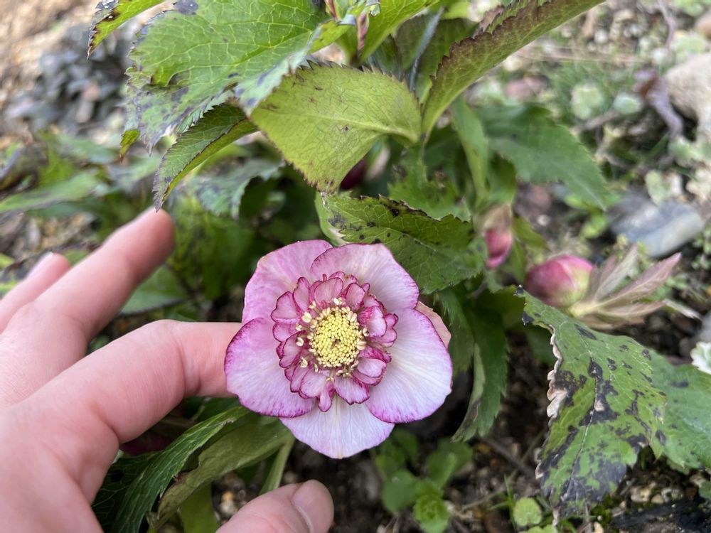 2枚目は月曜に道の駅でゲットしたお迎えクリスマスローズ⑥クリーム色の多弁に紫の糸ピコ