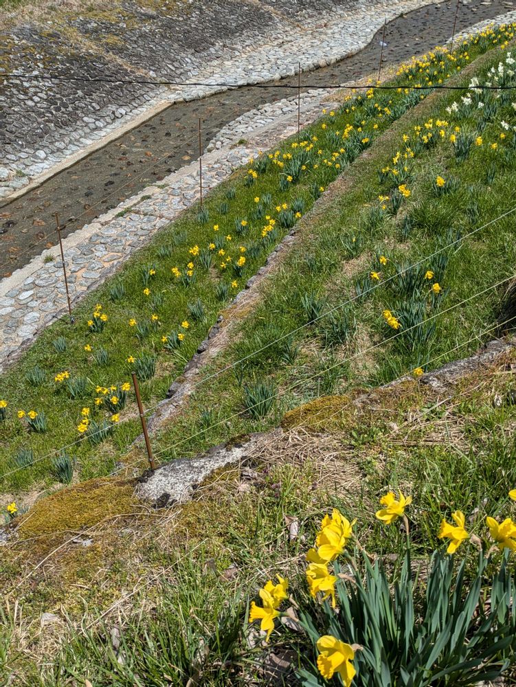 ⑤又兵衛桜の周りに広がる水仙と川の流れ