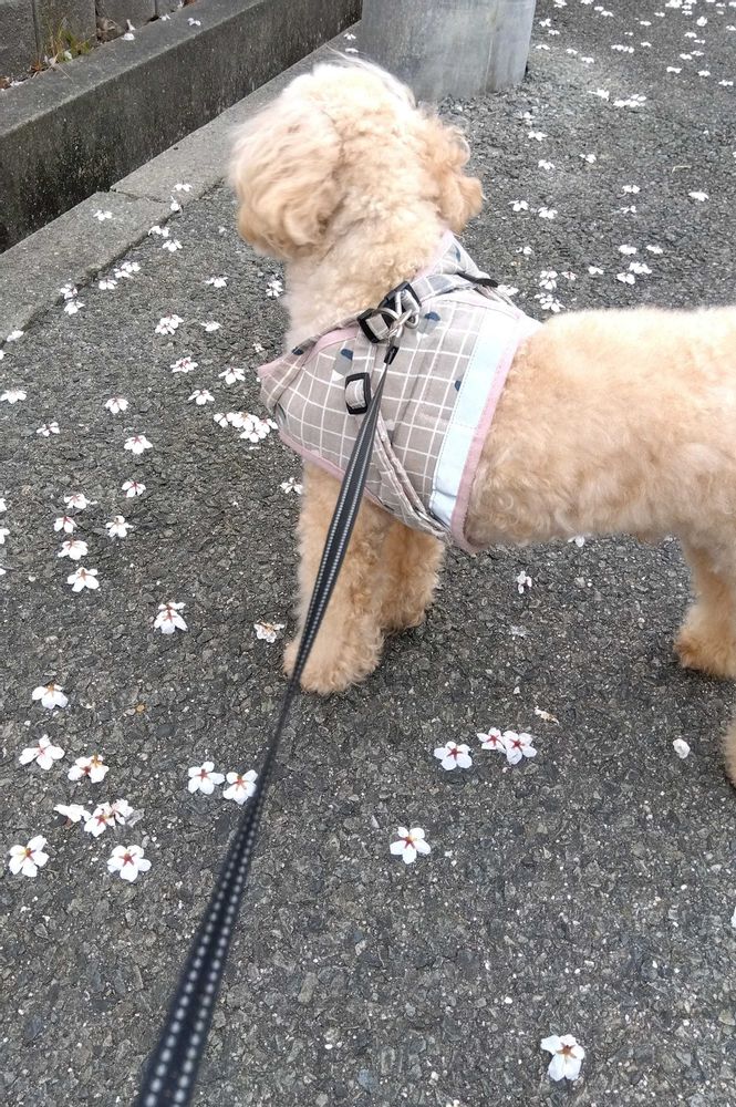 ⑤散った桜が道路に下向きに落ちていてるのが可愛い😍と思いワンコと一緒に撮ろうとしましたが、またカメラに向いてくれず😂