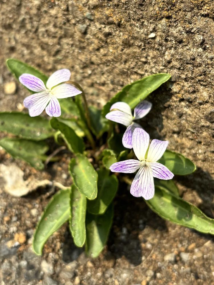 ①シロノジスミレ?調べていたら特徴が近いと思いましたが…🤔本日いつも通る道で忽然と咲いていて✨こんなに白いお花は初めて見ました