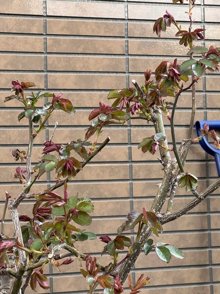ピエールドロンサールの新芽が伸びてきたよ❣️一昨年はたわわに咲き誇っていたのに、去年はかなり貧相だった😭😭花芽が付いて無い枝が何本もあって泣く泣く切り落としたよ。でも残った枝からこんなに新芽が伸びて来てめっちゃ嬉しい、感動しちゃう🥰🥰