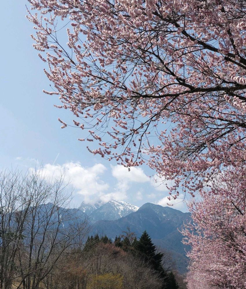 桜と甲斐駒ヶ岳の花景色も、美しいですね〜大木があるのですねー🤗