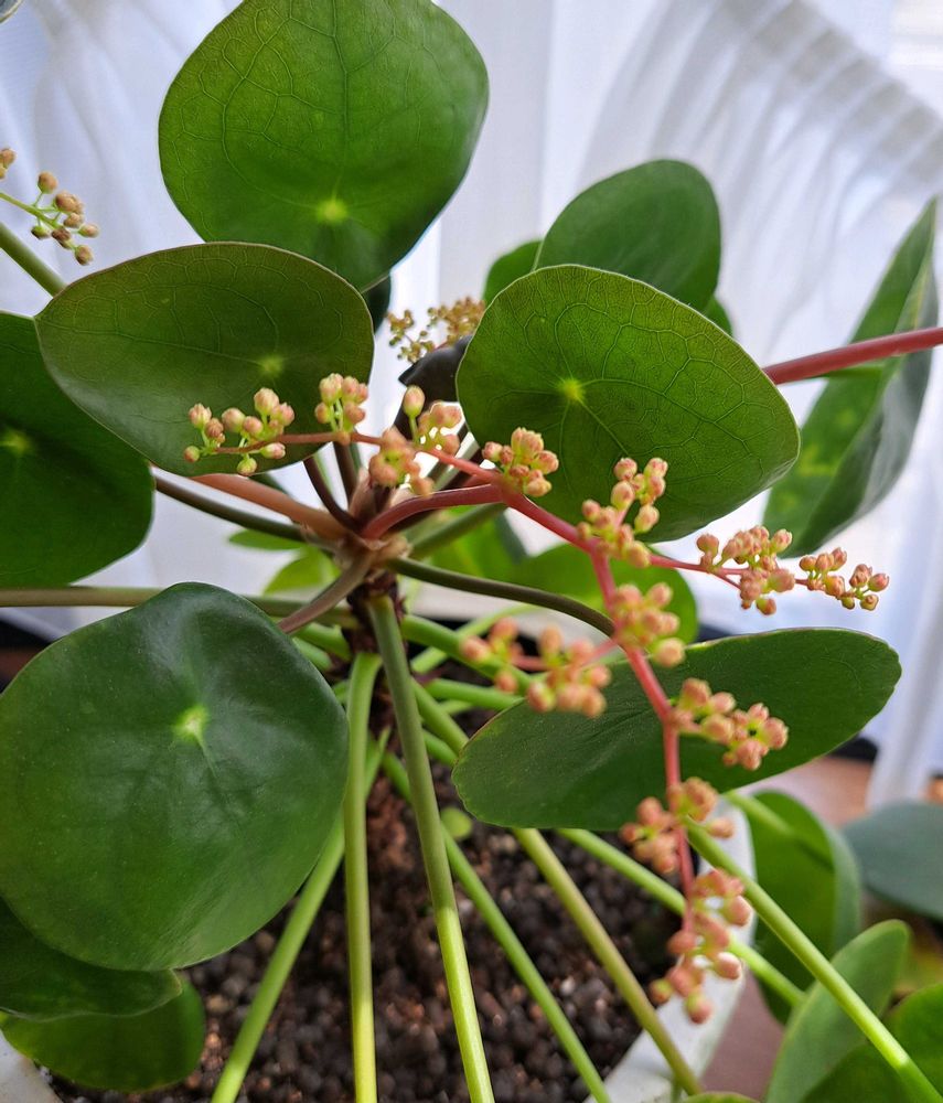 パンケーキプランツ🥞に蕾がついてどんどん伸びてきました。これはもう咲いている状態なのかなぁ('_'?)