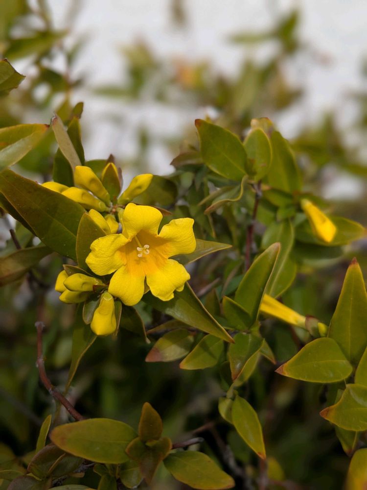 二階テラスのプランターでは老木カロライナジャスミンが〜頑張ってお花を咲かせている💪😃🎶!!