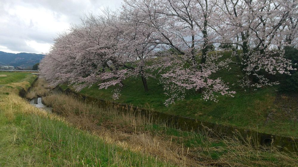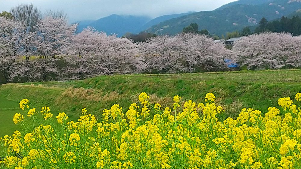 雨の合間に散歩。川沿いで満開の桜と菜の花です。🌼🏵️🌸