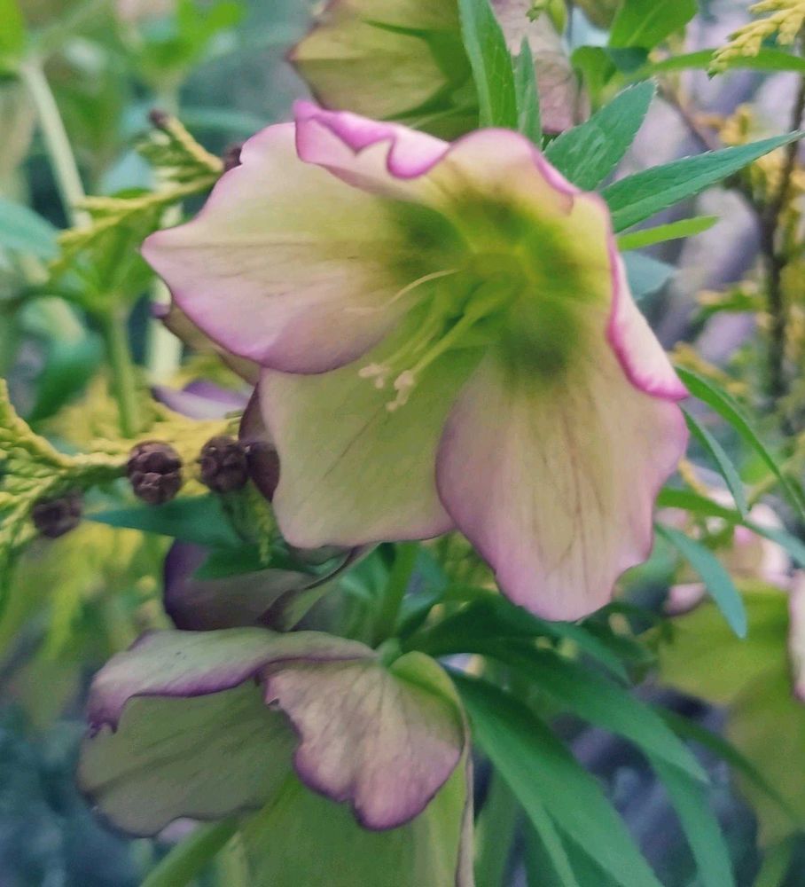 知らないうちに、クリスマスローズが咲いていました。うつむき加減でひかえめです。