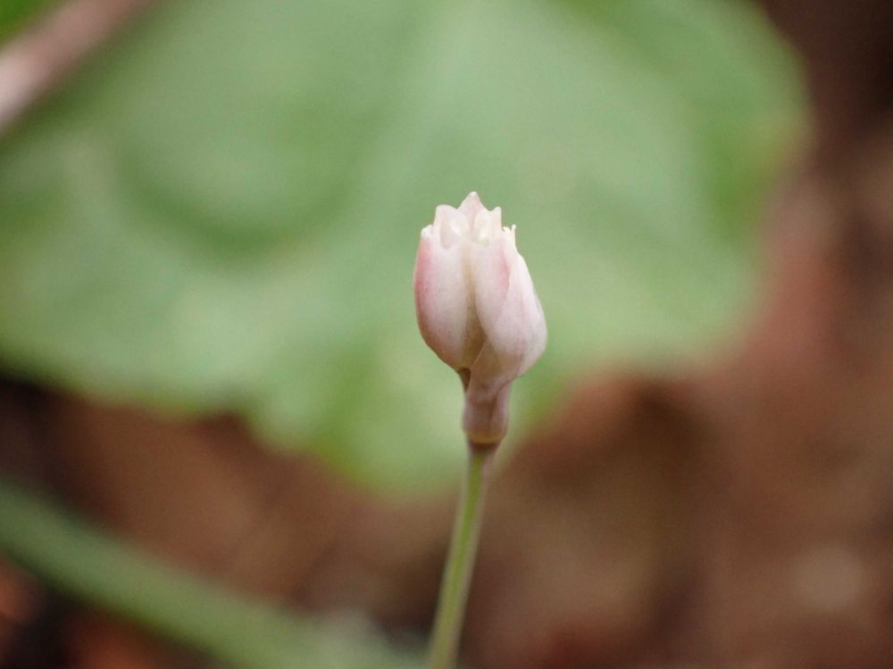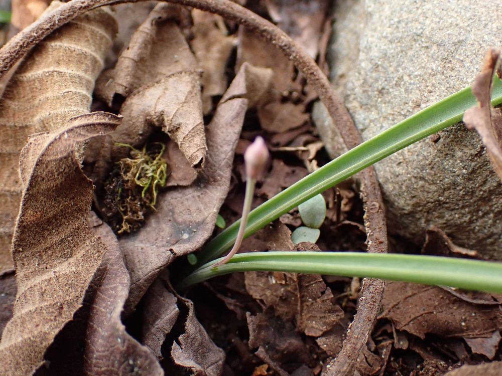 なにしろ、小さいんです。枯葉の中から、ピュンと葉っぱが出ていて、その葉っぱのところから、すっと、花が出ています。これは蕾(④)