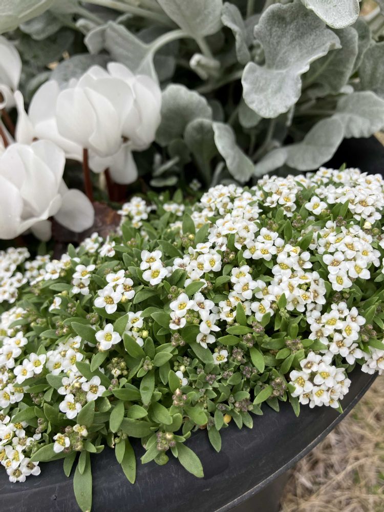 ガーデンシクラメンの白、とってもきれいです✨アリッサムも大好き💕