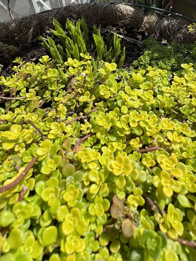 🍀黄金丸葉万年草と小型の斑入りギボウシ どちらも元気な顔を見せています