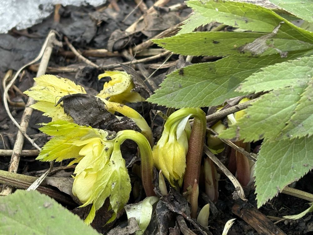 今年は雪解けが遅いので、クリスマスローズの所だけ雪割りをしてみました。