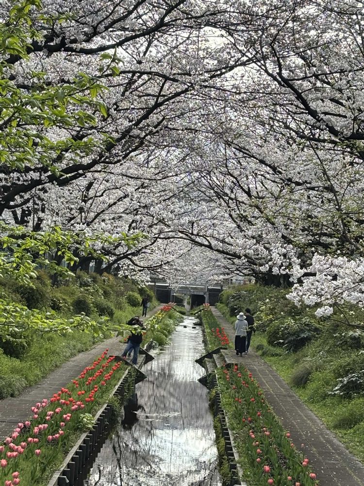 ほぼ満開の桜と川の両側に植えられたたくさんのチューリップ🌷🌸🌷🌸🌷🌸🌷🌸🌷🌸🌷🌸