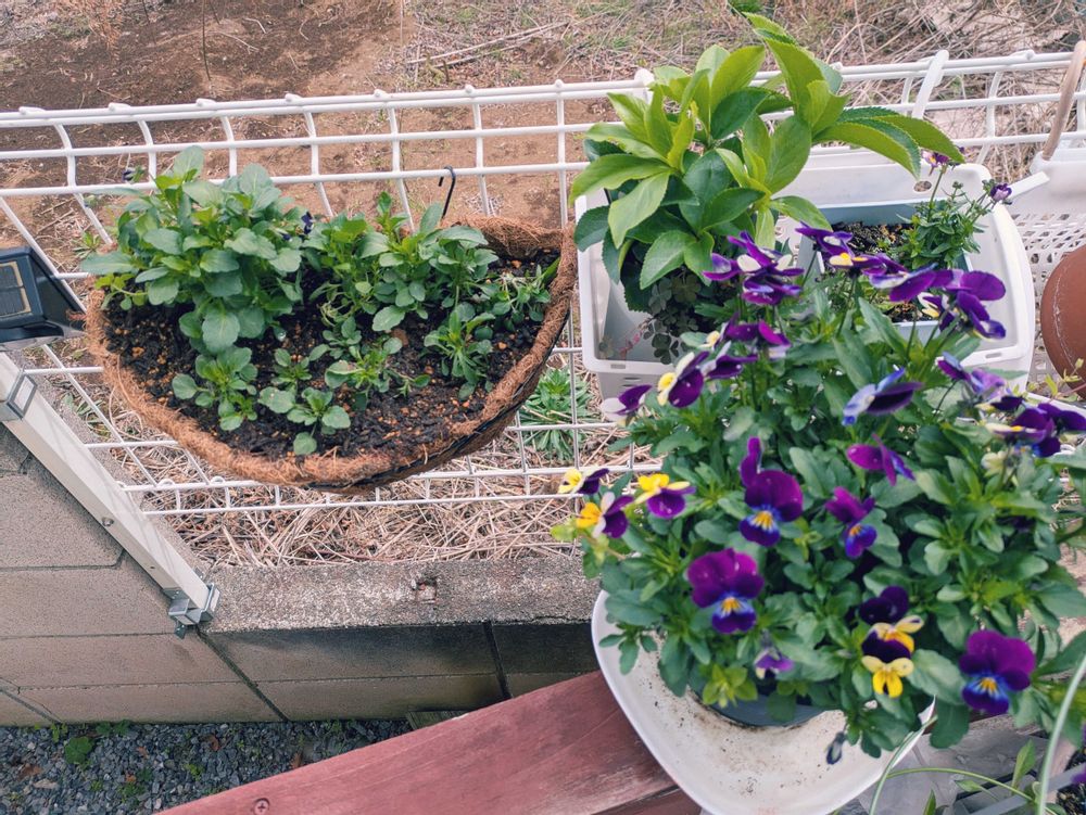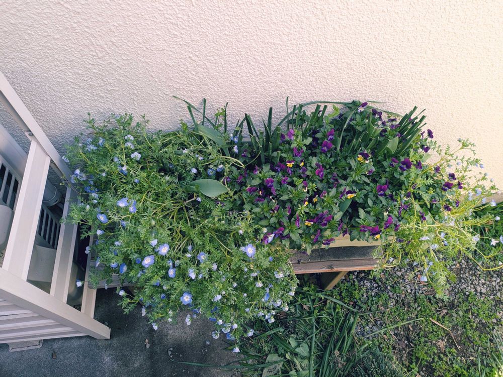 自家採種3代目ビオラとネモフィラが元気に花を咲かせてます。
