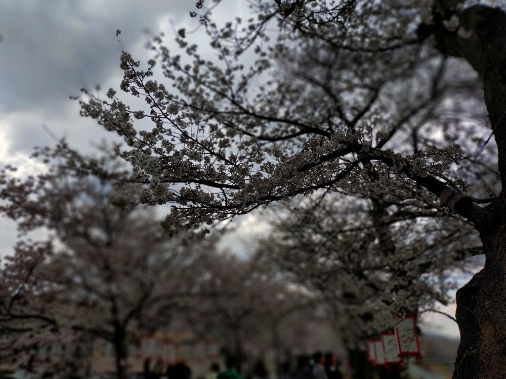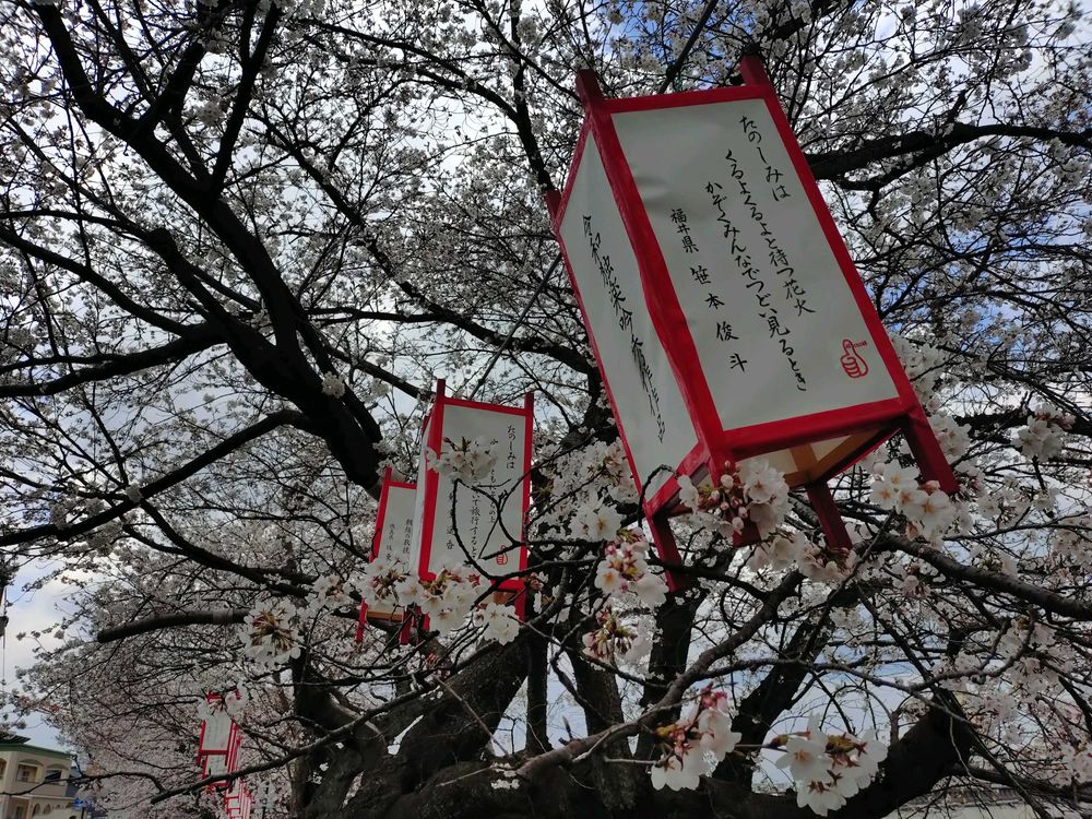 桜の開花時期に合わせて、地元の中学生が詠んだ独楽吟をあしらった手作りのぼんぼんが吊り下げてあります。