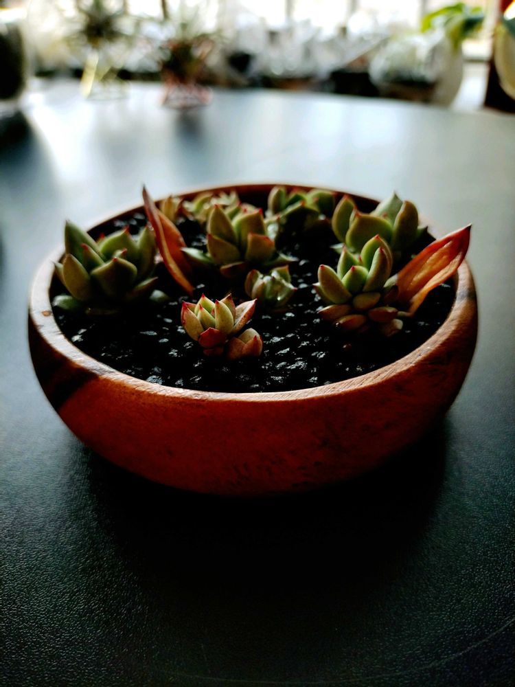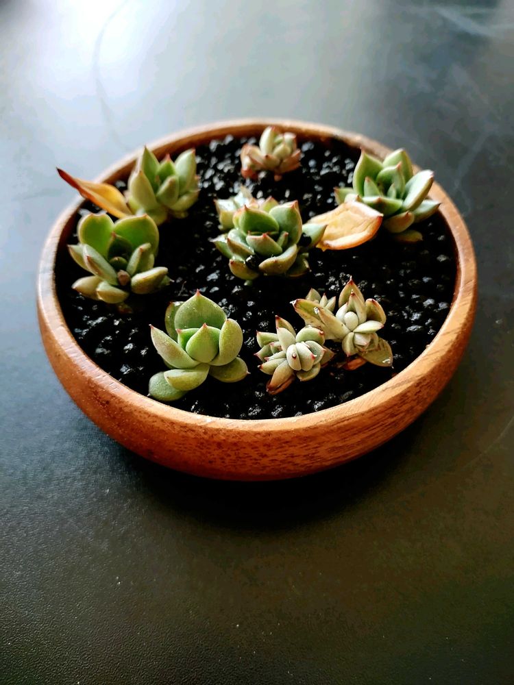 セリアのアカシアボウルに葉挿しで(放置して)育てたエケベリアを植え込み。
