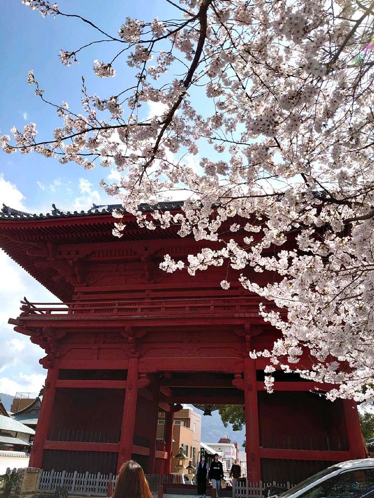 真っ赤なお寺さんと、ピンクの桜🌸がよく合うね!