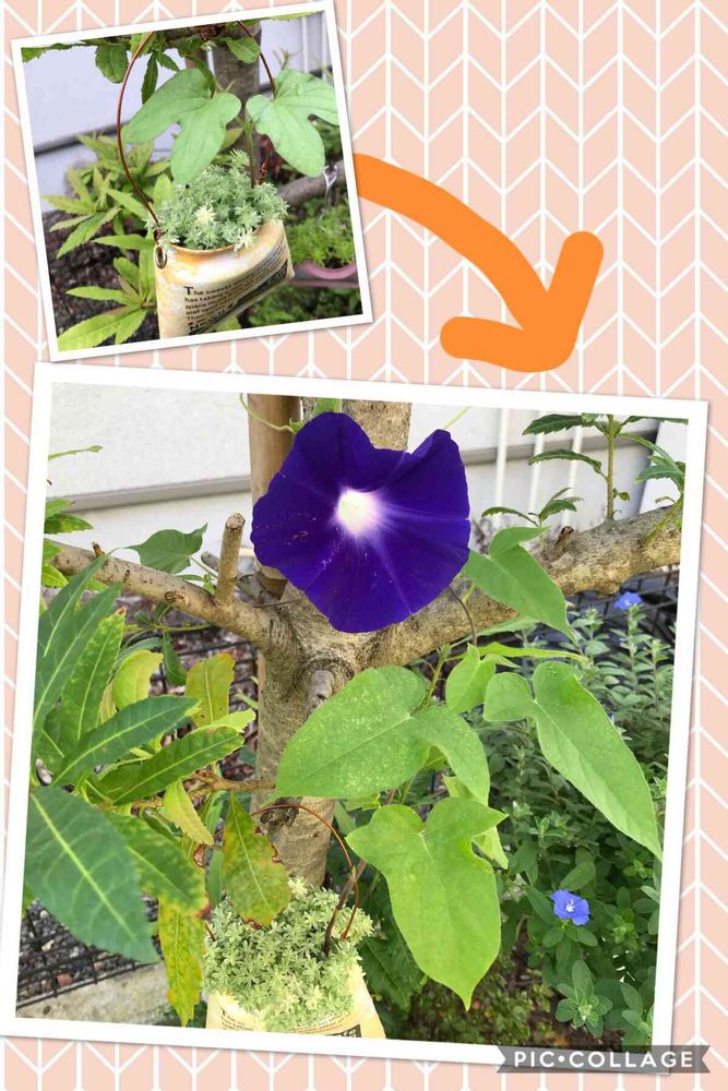 ヤマモモの木に吊るしてあるミルクゥージからひょっこりと出てきた零れ種の朝顔が、なんとか開花まで漕ぎ着けました🏵