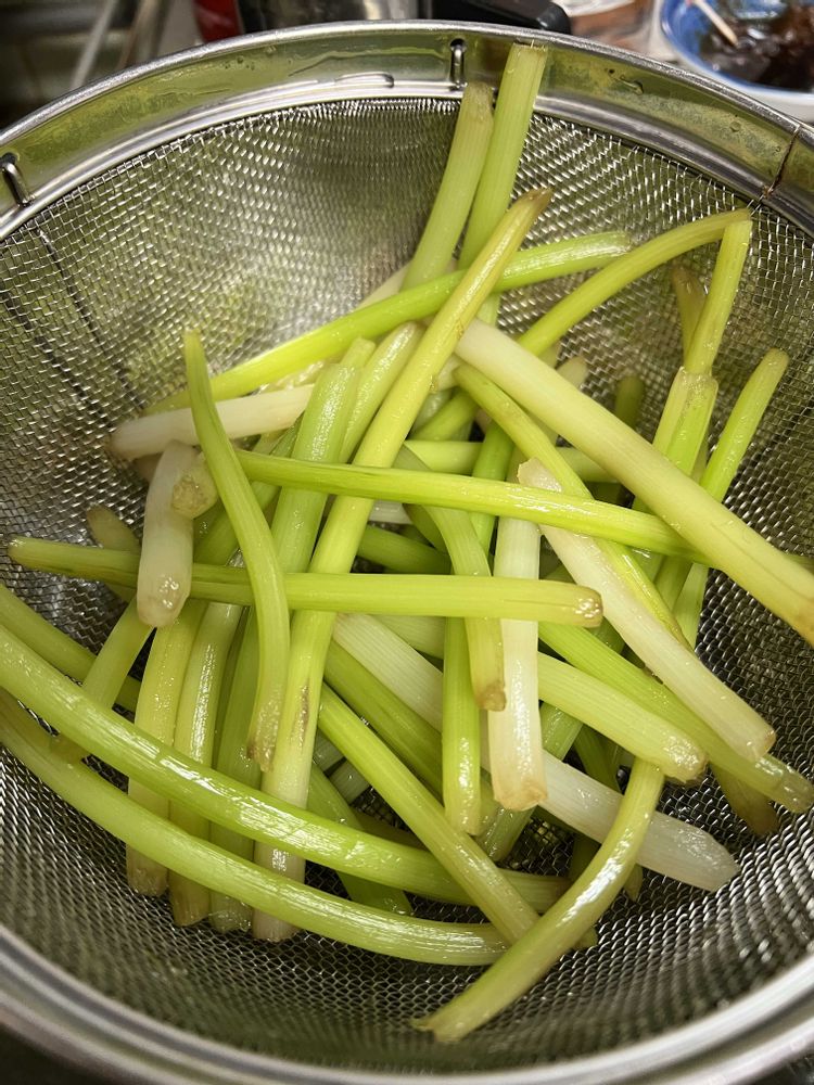 ボールに水を入れておき、剥きながら食べやすい長さに折り、直ぐに水にインです。