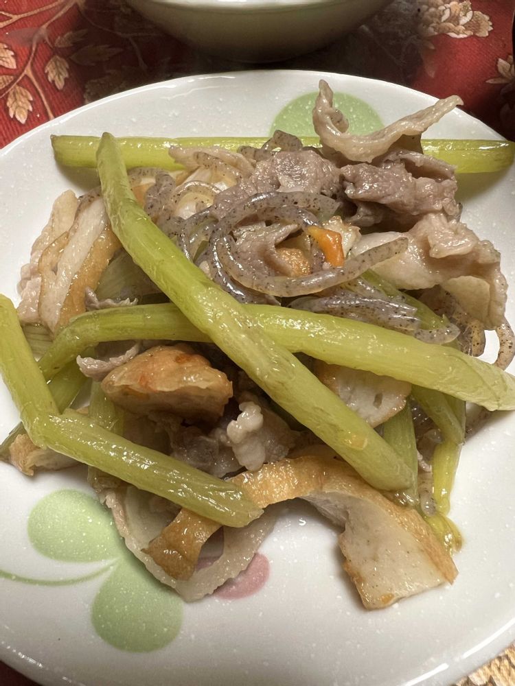 今回の具材は、冷蔵庫にあった豚肉と丸天と糸こんにゃくです。これらをごま油で炒めます。火が通ったら茹でたツワを入れます。豚肉と丸天からいいお出汁が出るので、白だしで味付けです。