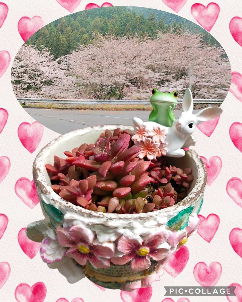 1枚目 yubaraさんの🌸エンジェル鉢に桜吹雪🌸と名探偵みゆちゃんから頂いた🐸のコポタン&🐇ちゃん🌸