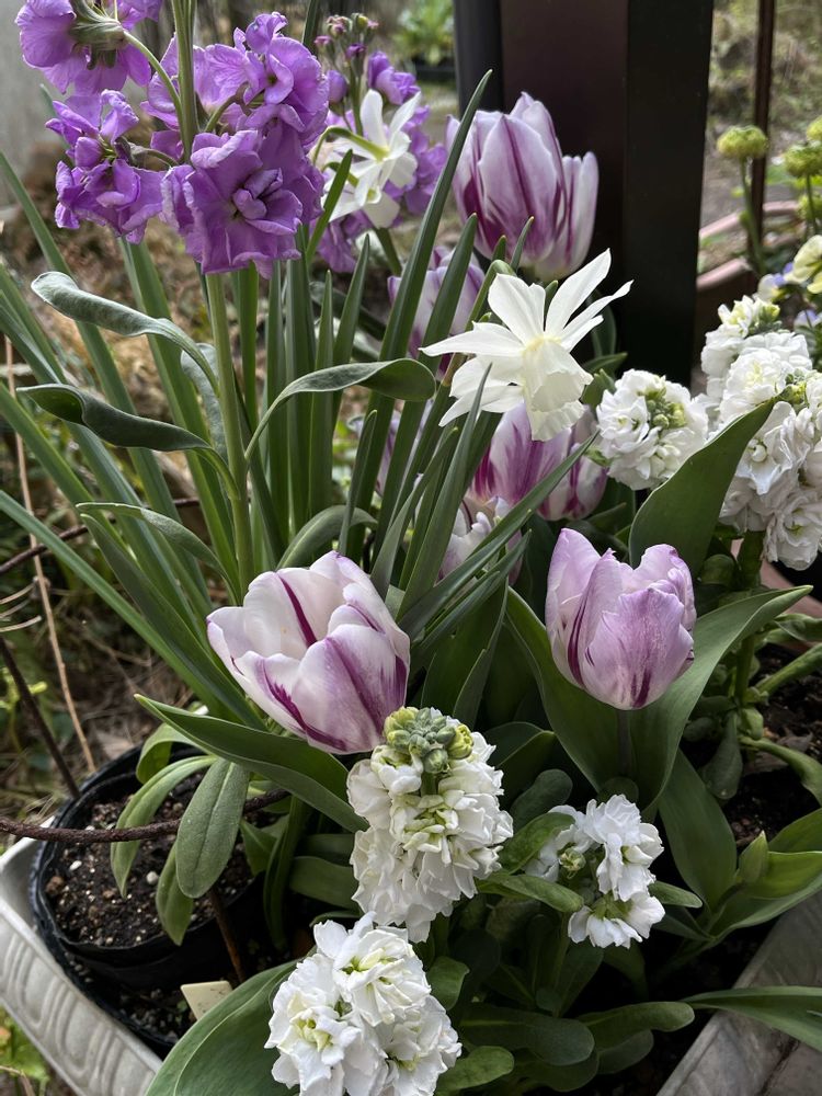 ❶ラナンキュラス ラックスアイオリア✨✨順調😊❷アネモネ品種名不明✨✨昨シーズン多くの球根が⭐️になった中、稀有な生き残り組🙏❸ラナンキュラス エトワール✨✨もう八重は咲かなくなったけど一重が沢山咲いています…もうそろそろ終わりですネ🤭✨❹❺チューリップのコンテナで寄せポットコンテナ作ってみた😆✨💦