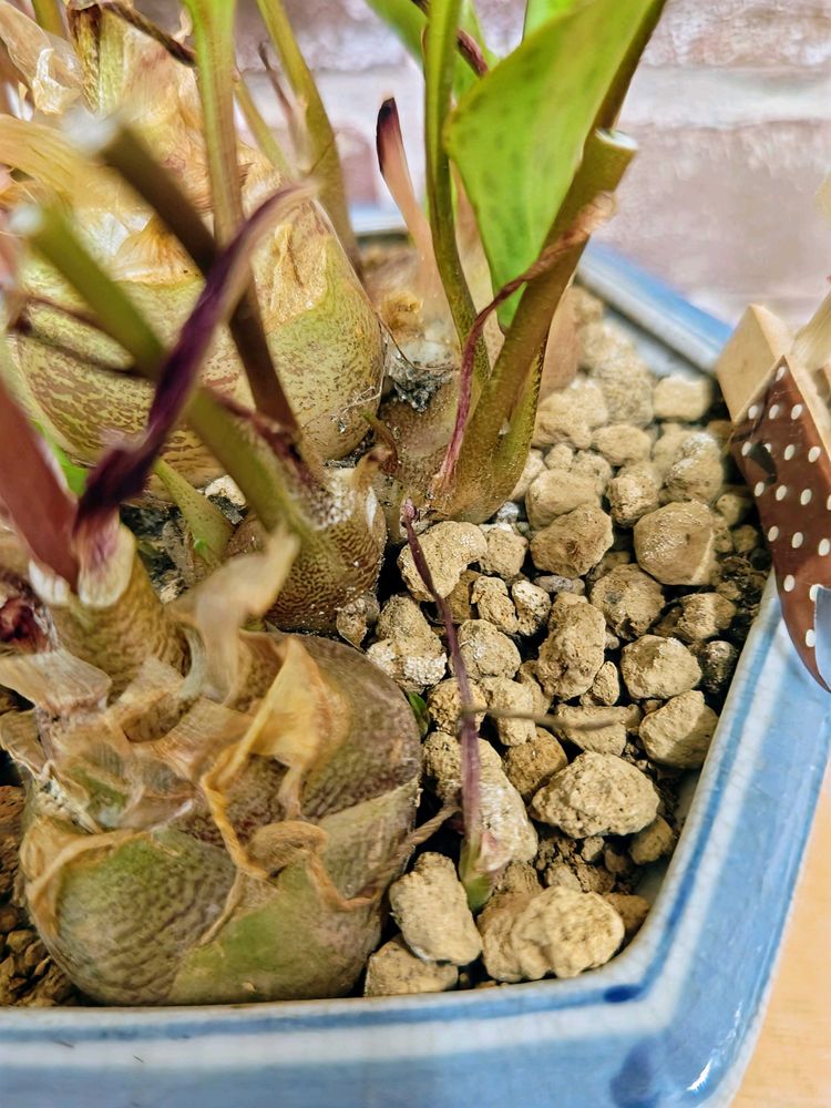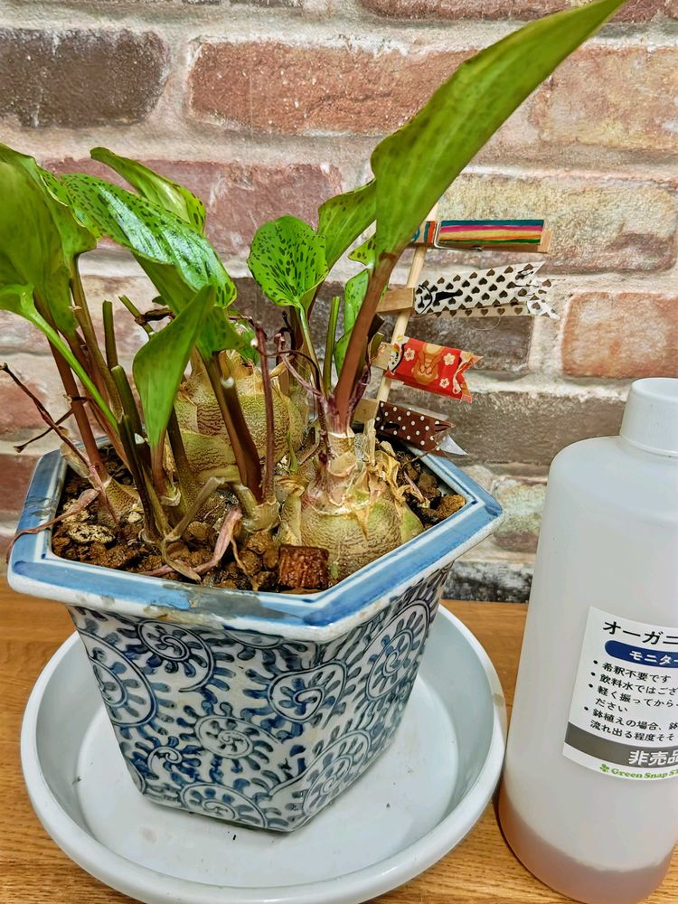 昨日、ドミオプシスマクラータに2回めの活力水あげました。上の方の赤玉土が白っぽくなるまで水分控えてからの活力水。残ってる活力水殆ど使って、鉢底から流れ出ました。