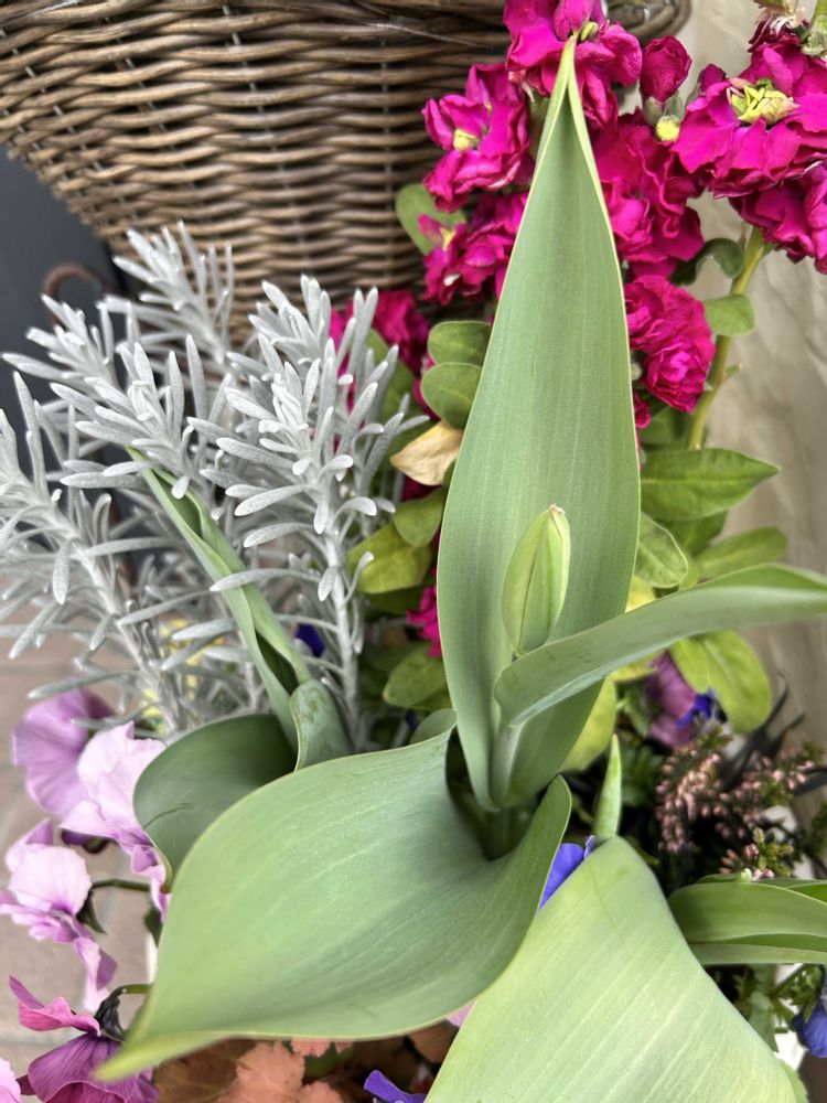 秋にチューリップ🌷の球根を忍ばせた寄せ植えに蕾が出てきました。