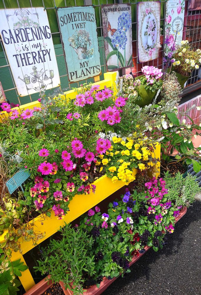 イエロー手作りベンチプランターモリモリさん達が祝ってくれていますね㊗️