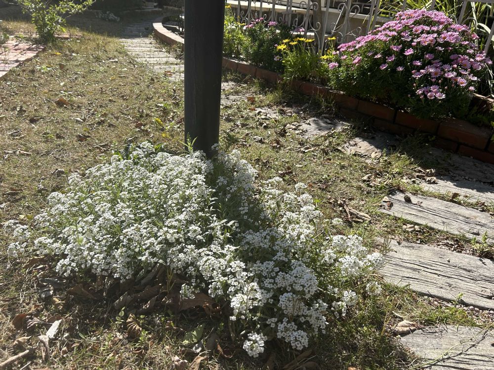 芝生エリアをもう少し華やかにできないかな?と思い昨年晩秋に試しにお迎えしてみたPWさんのスーパーアリッサム、冬は完全放ったらかしで無事に越冬してくれました😊すでに2株がここまで成長してます☀️大正解でした😍