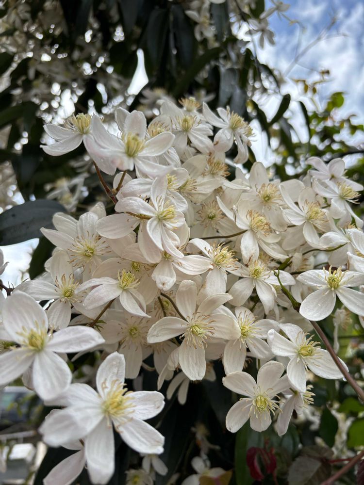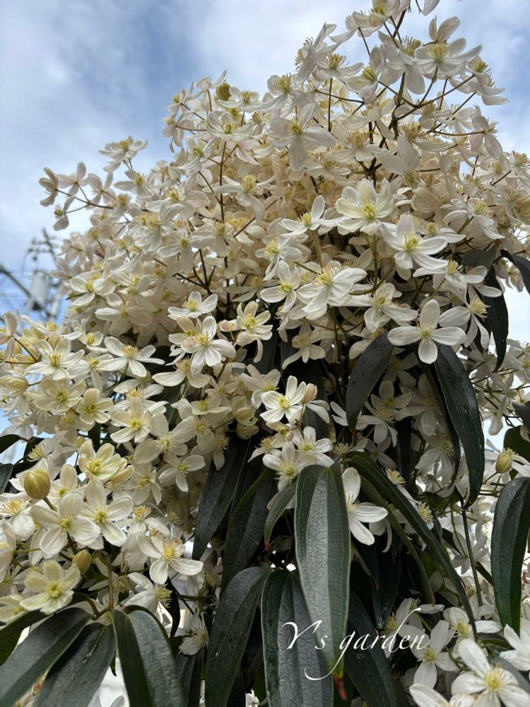 常緑クレマチスのアーマンディーが満開を迎えています。