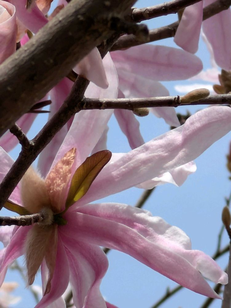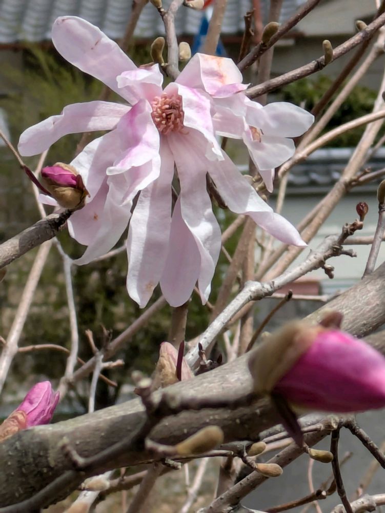 大宇陀、森野旧薬園近くで。昨年も同じような時期に見たのに、桃色のコブシと思っていた。