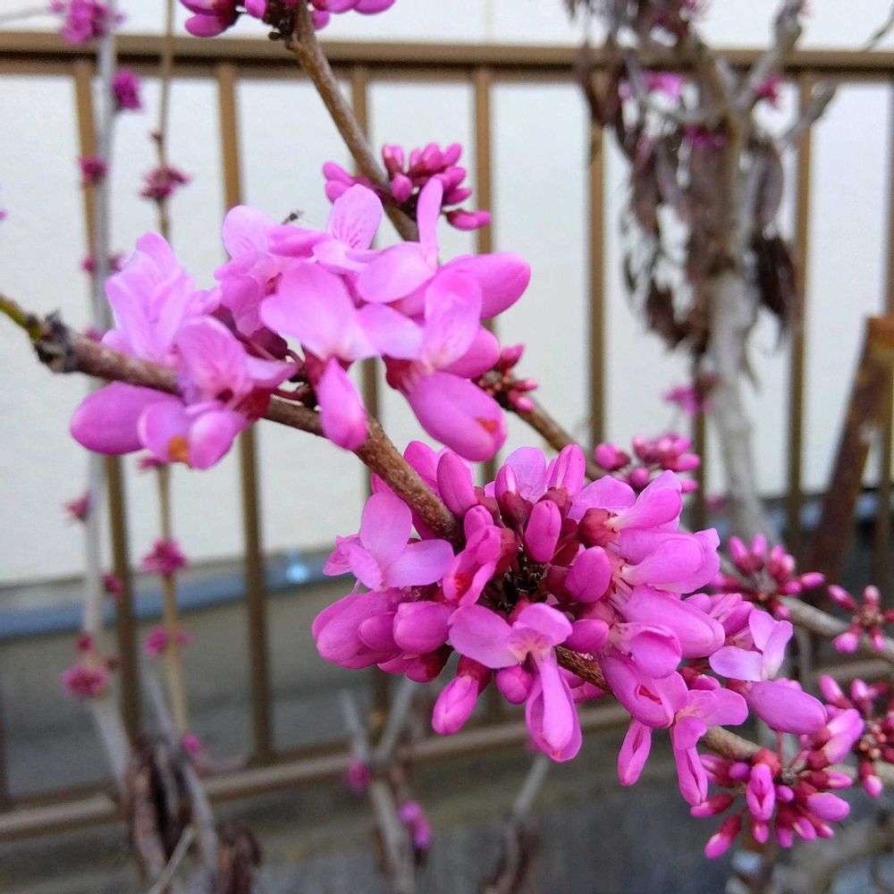 お隣の畑で咲き始めた鮮やかなピンクのハナズオウ💗