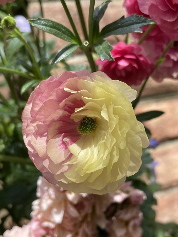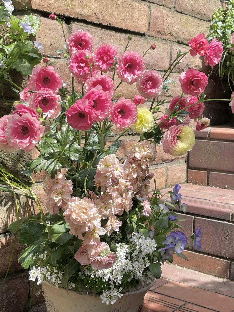 ラナンキュラス ラックス ヘラと12月に寄せ植えた花達がやっと咲き揃って満開です🌸 ピンクの中にレモン色の子が混ざり 可愛い💐 他のラックス達も次々と開花ラッシュ♡ アップしなきゃ💦