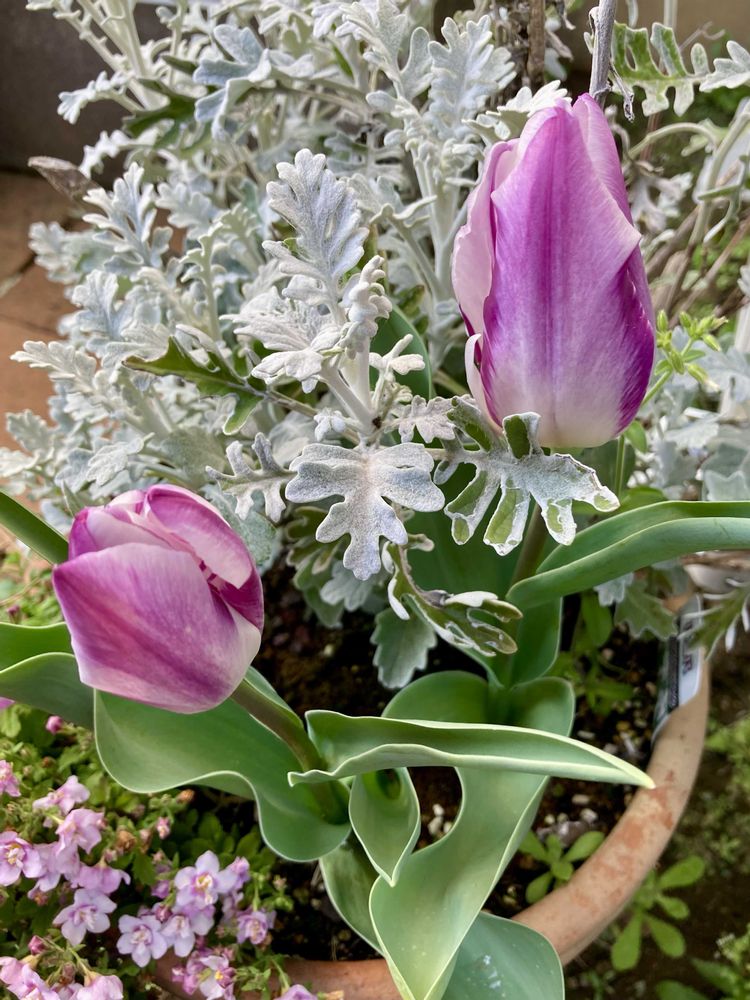 寄植え、なかなか良い雰囲気になりました💕2年目のチューリップの球根の色を忘れちゃったから、出てきてくれるまで、チグハグな寄植えになったらどうしましょ〜と思ってましたが…🤭