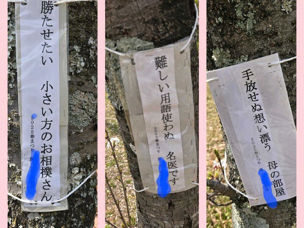 桜の木の幹には、先日の春祭りの川柳倶楽部さんの句が貼られています。